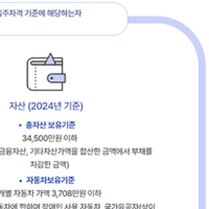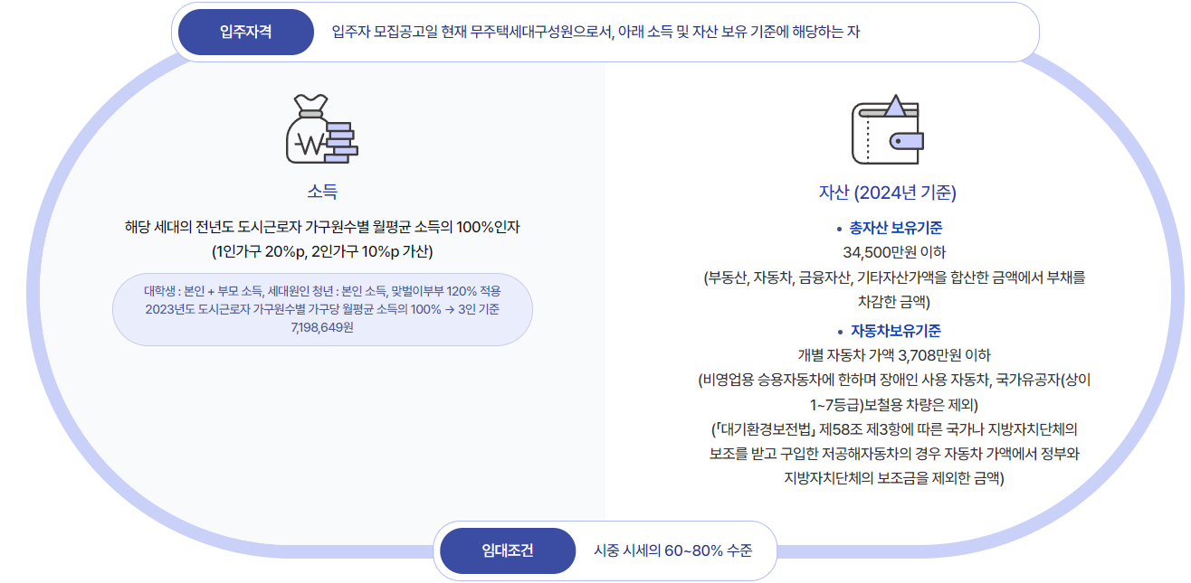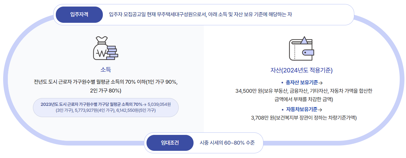 소득 기준은 전년도 도시근로자 가구원수별 월평균소득의 70% 이하여야 합니다. 예를 들어, 4인 가구 기준으로 2024년에는 월 4,315,641원 이하의 소득이어야 해요. 자산 기준도 있는데, 총자산은 3억 2,500만원 이하, 자동차는 3,557만원 이하여야 합니다.