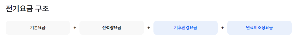 가정용 전기요금은 크게 네 가지 요소로 구성됩니다 기본요금, 전력량요금, 기후환경요금, 그리고 연료비조정요금입니다. 이 네 가지가 모여 우리가 매달 지불하는 전기요금이 되는 거죠.