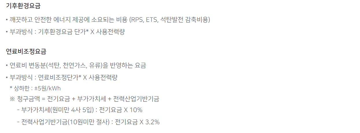 가정용 전기요금표에는 기본요금과 전력량요금 외에도 기후환경요금과 연료비조정요금이 포함됩니다. 이 두 요금은 상황에 따라 변동될 수 있는 요금들입니다.